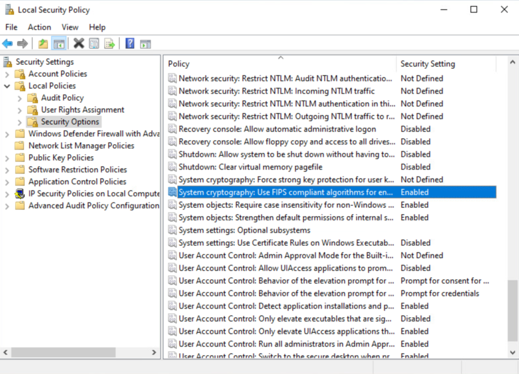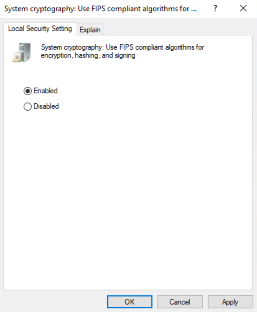 To enable FIPS, open the Local Security Policy (secpol.msc) and enable the policy called System cryptography: Use FIPS compliant algorithms for encryption, hashing, and signing under Local Policies > Security Options.