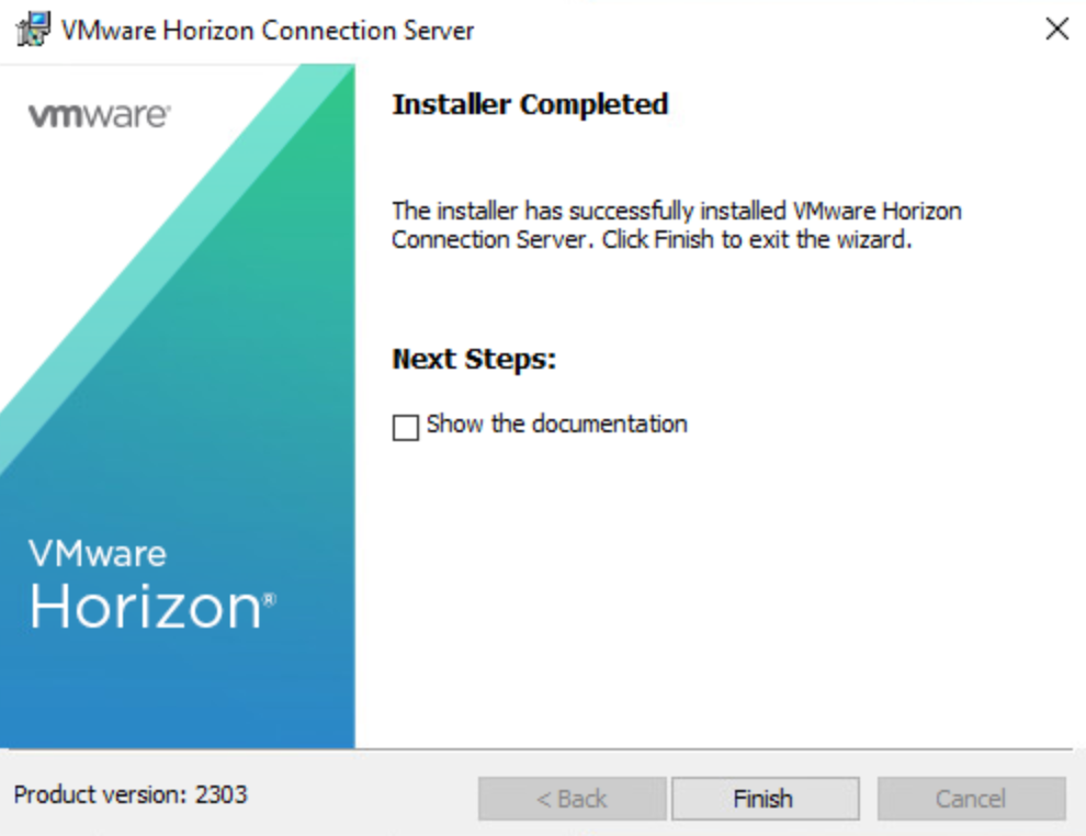 When the installer completes, uncheck the Show the documentation checkbox and click Finish.