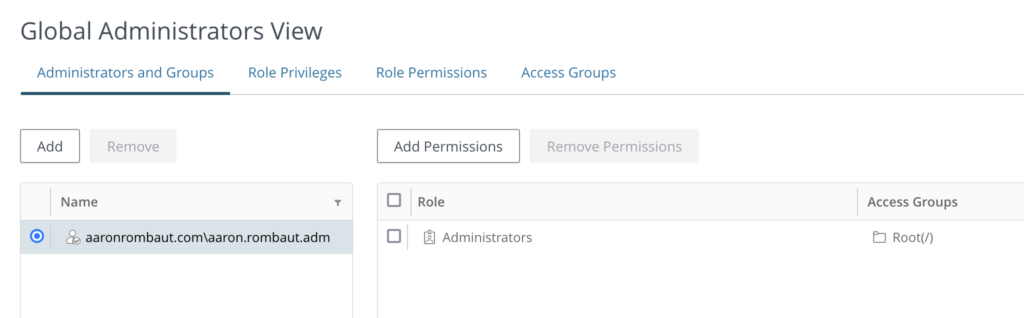We can verify the security group has been added and see that it is a member of the Administrators Role. I suggest removing the user account and relying on only the security group.