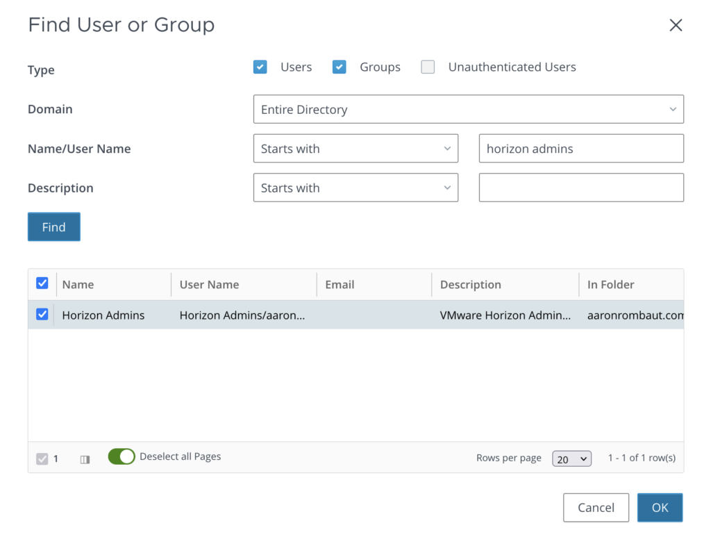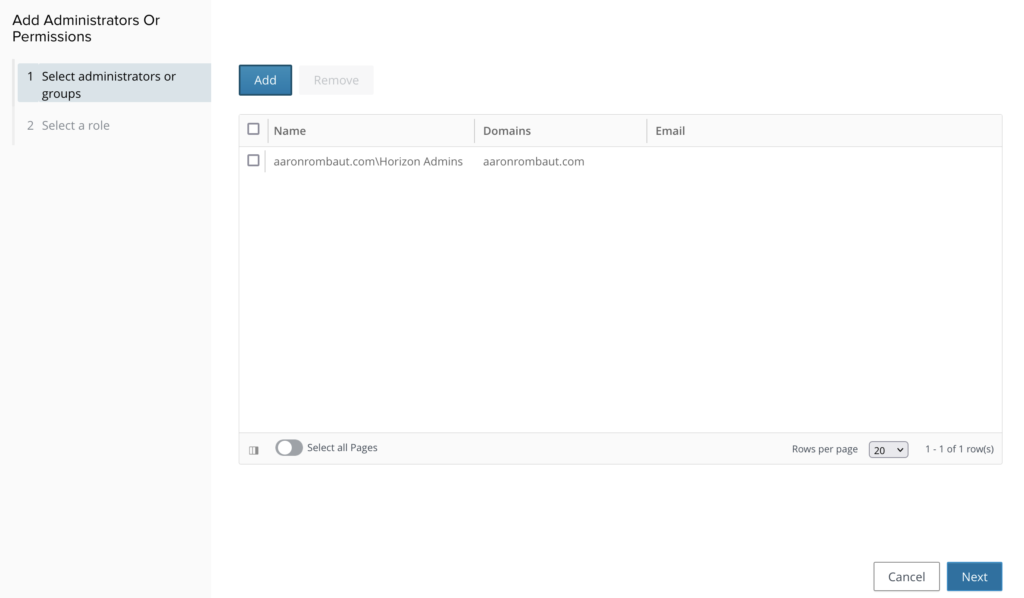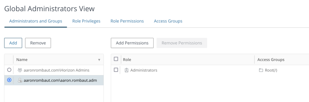 If you have been following along, there is only one account that can access the Horizon Admin Console right now. Click Settings > Administrators and lets configure this with a Security Group. Be sure the account you are logging in with is a member of this security group.