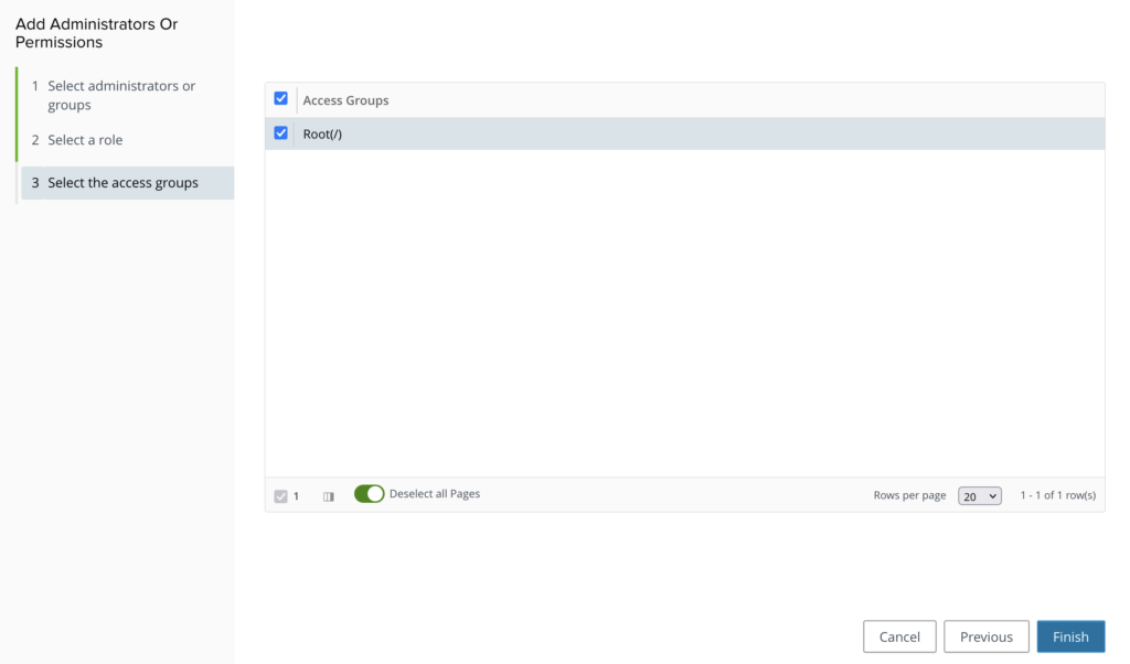 Check the Root(/) access group and click Finish.