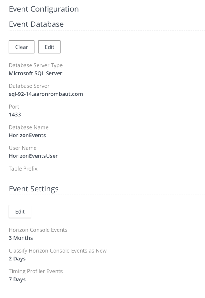 Ensure that you have already configured a database and local SQL user for VMware Horizon Events. VMware Horizon does not use integrated Windows authentication.