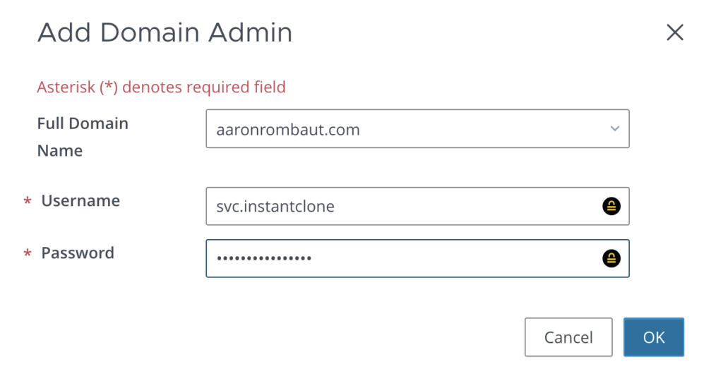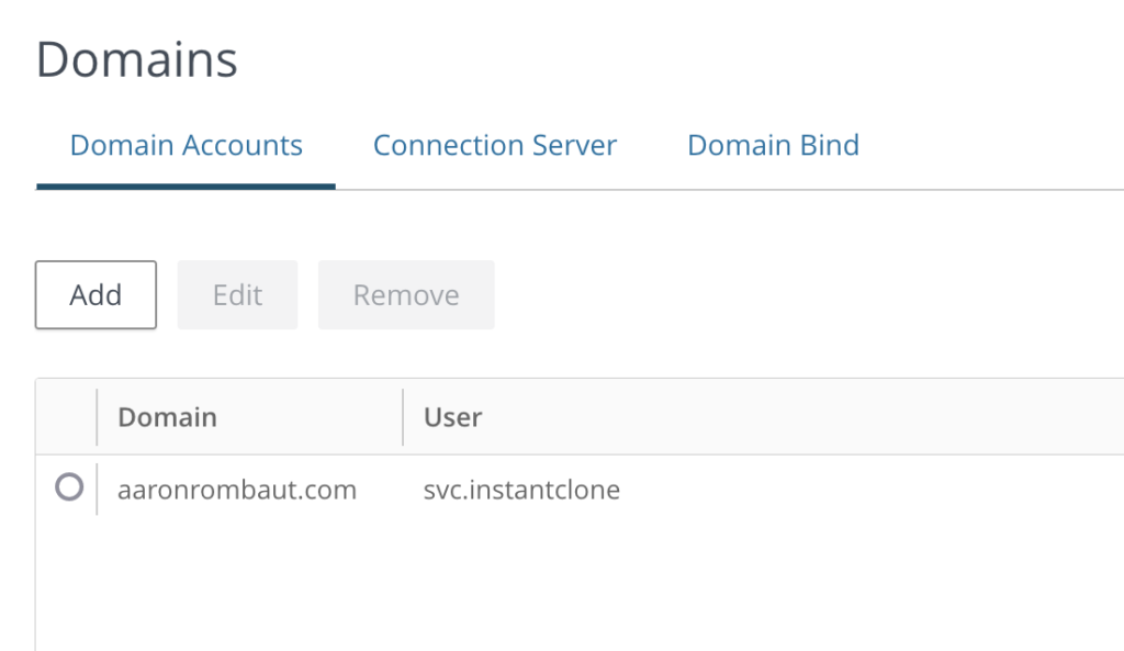 I configured an Instant Clone account as a service account in Active Directory and then added, here.