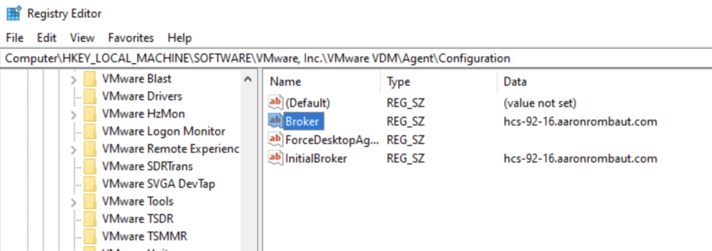 Computer > HKLM > SOFTWARE > VMware, Inc. > VMware VDM > Agent > Configuration > Broker