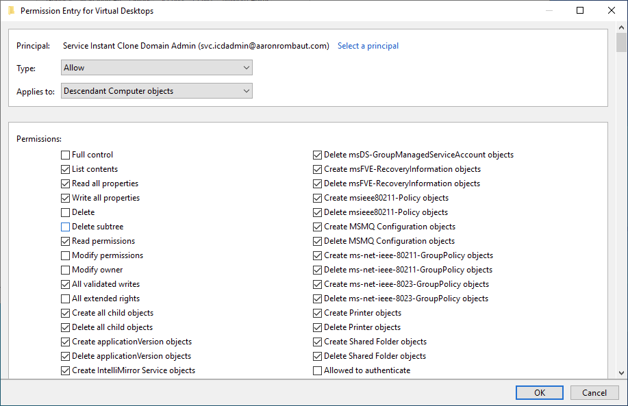 - Add the Create Computer Objects, Delete Computer Objects, and Write All Properties permissions to the account on the container for the instant-clone computer accounts. The following list shows the required permissions for the user account, including permissions that are assigned by default: