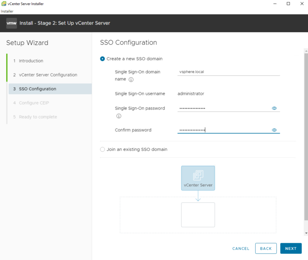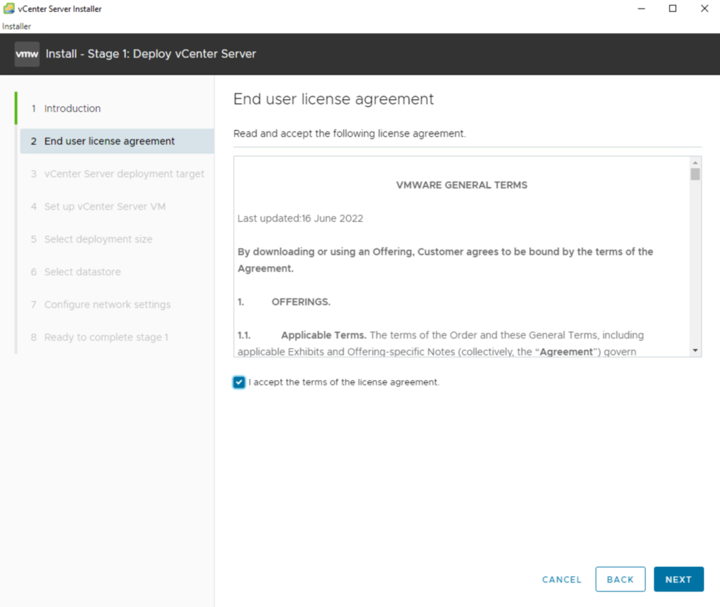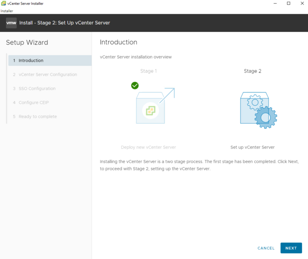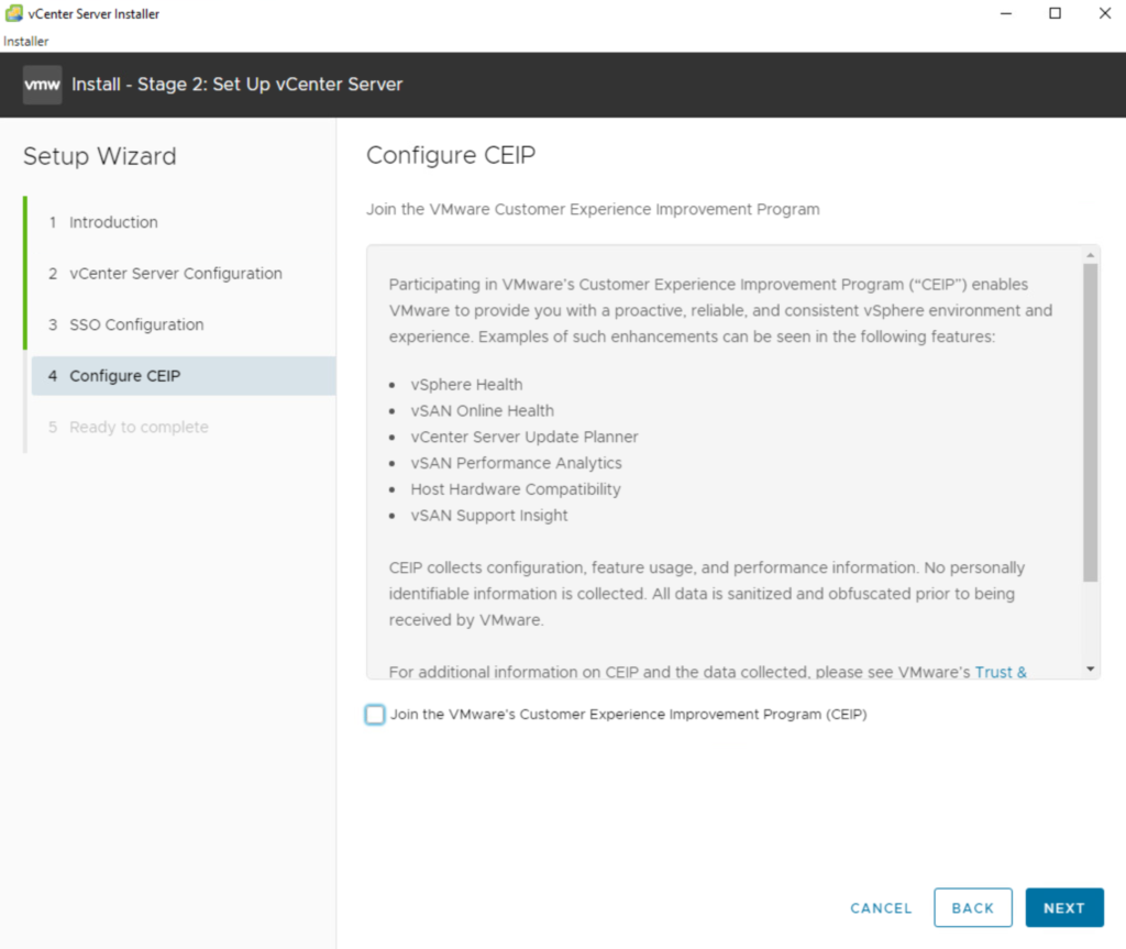 I choose not to Join the VMware’s Customer Experience Improvement Program (CEIP) so I uncheck the box.