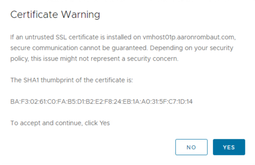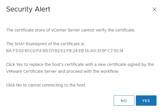 If the certificate is not trusted (i.e. the ESXi host certificate has not been swapped out yet) then the following Security Alert window might display. Verify the SHA1 thumbprint of the vCenter server.