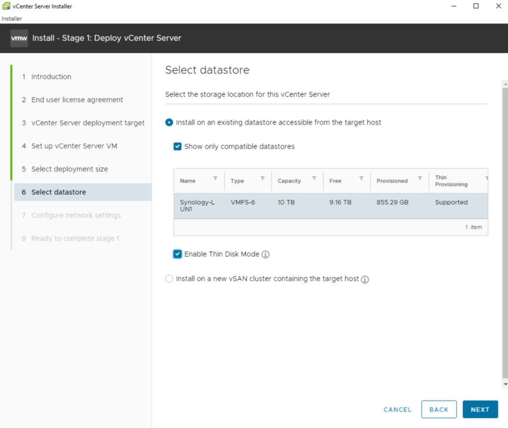 I am leaving the default option of Install on an existing datastore accessible from the target host and I chose to Enable Thin Disk Mode. Click Next.