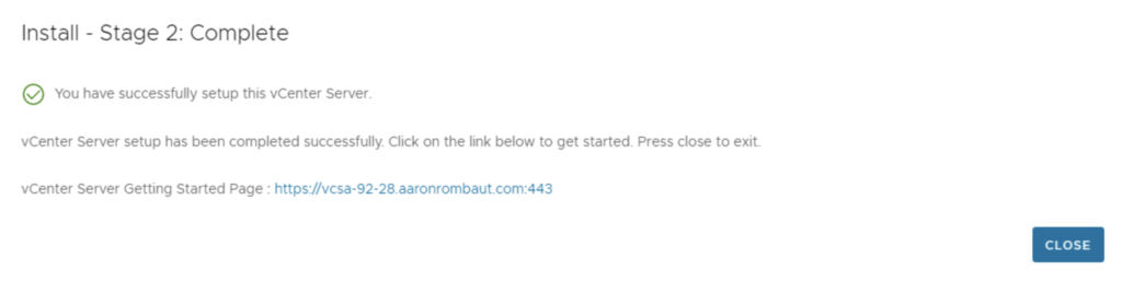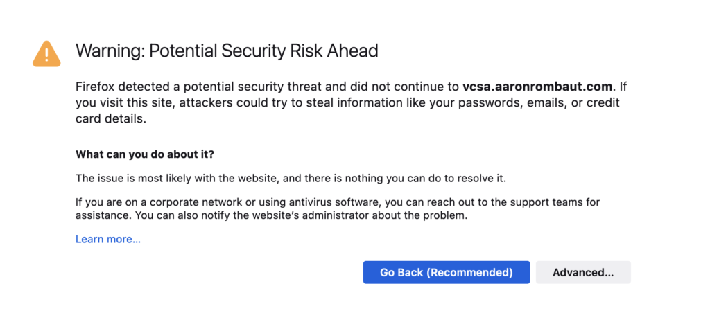 Open up a web browser and navigate to the fully qualified domain name and add the port 5480 to the end. It will look similar to https://vcsa.aaronrombaut.com:5480. Since the appliance is new and using a self-signed certificate, the browser should warn you. Get past the security warning according to your browser.