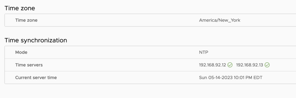 I will also check the Time settings and look for the green check marks to ensure the NTP is actually working. I will also set the time zone to be reflective of where I am setting this up.