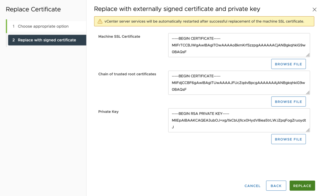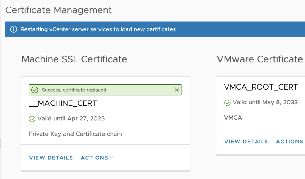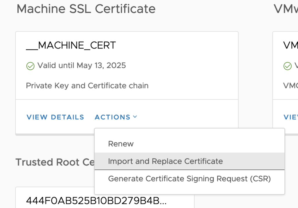 Click Import and Replace Certificate in the Actions menu of the Machine SSL Certificate.