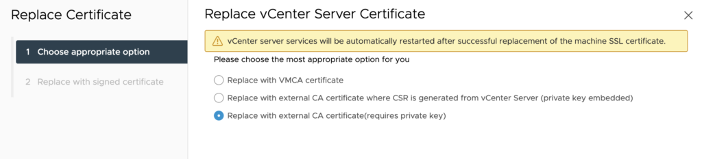If you do not change the mode, the VMware Certificate Authority (VMCA) will issue a self-signed certificate and render all of your work wasted.