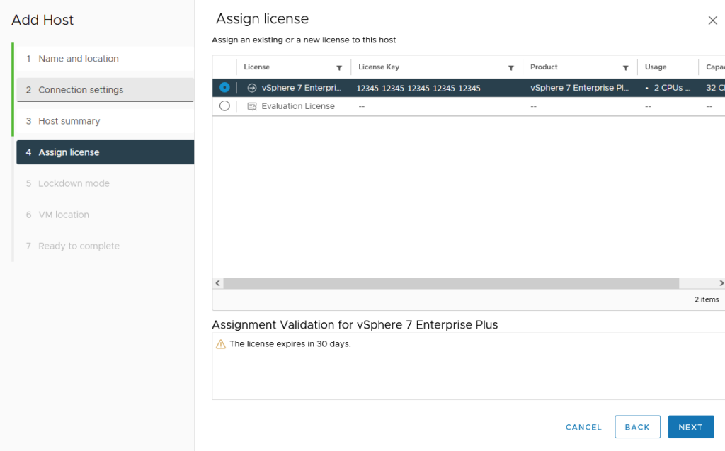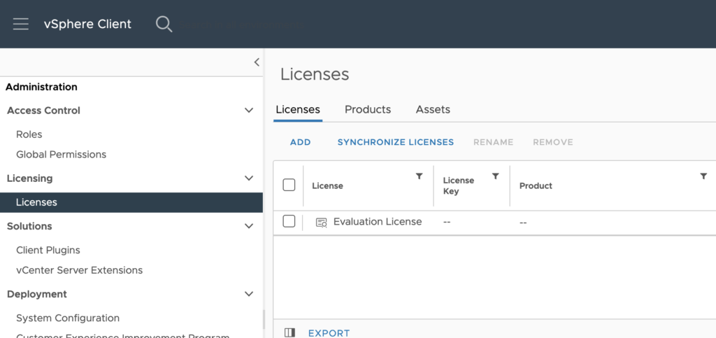 Add and assign the correct licenses to use for vCenter Server and ESXi hosts. I am not using NSX or vSAN, but those licenses can be added here as well.