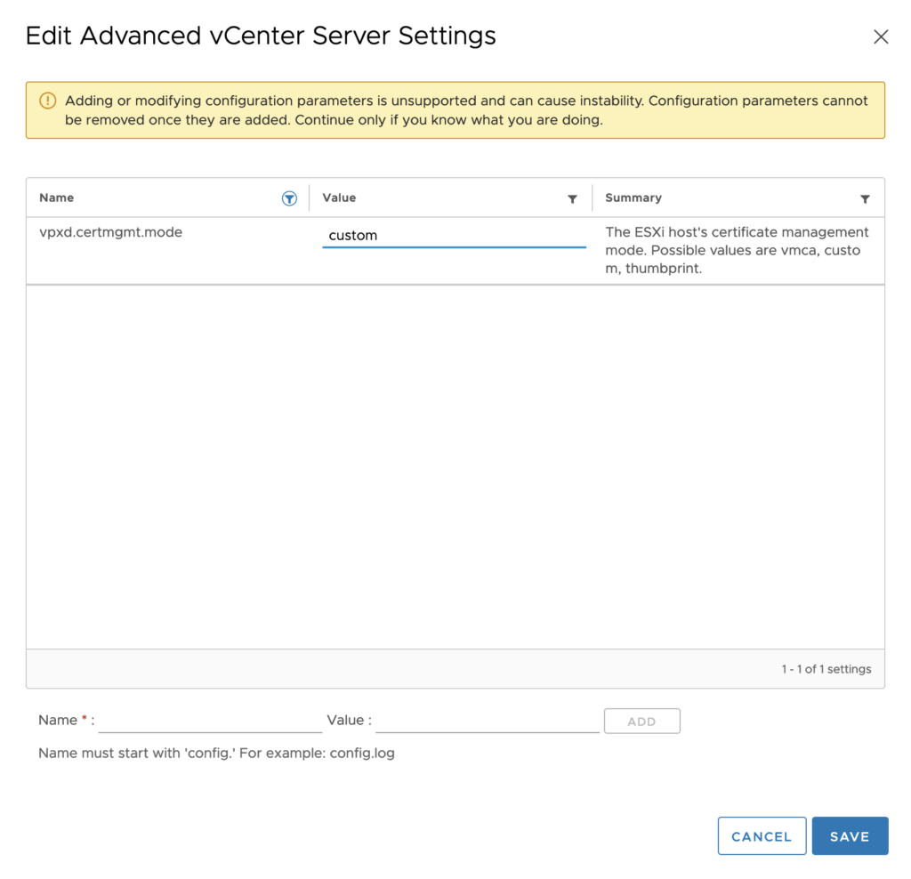 Log back in and change the certificate mode to custom if you plan on adding ESXi hosts with custom certificates. (https://docs.vmware.com/en/VMware-vSphere/7.0/com.vmware.vsphere.security.doc/GUID-122A4236-9696-4E1F-B9E8-738855946A93.html)