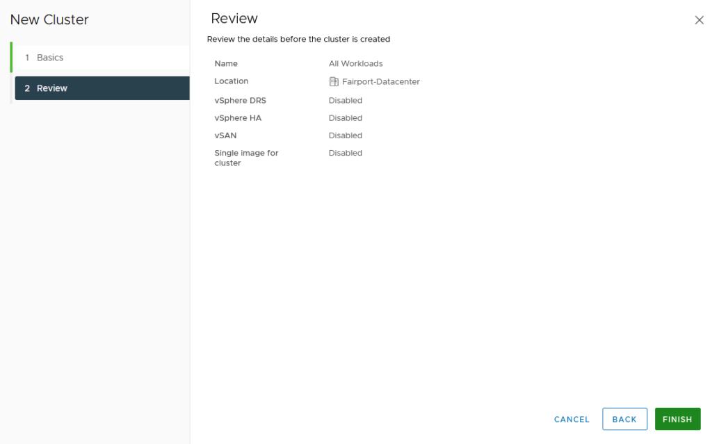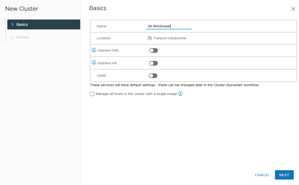 Even though I only have one host, I will need to add the host to a cluster. I just will not be running vSphere HA (high availability) or vSphere DRS (Distributed Resource Scheduler).