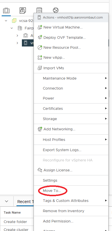 Click and drag the ESXi host into the cluster. Alternatively, right-click the host and move into the cluster.
