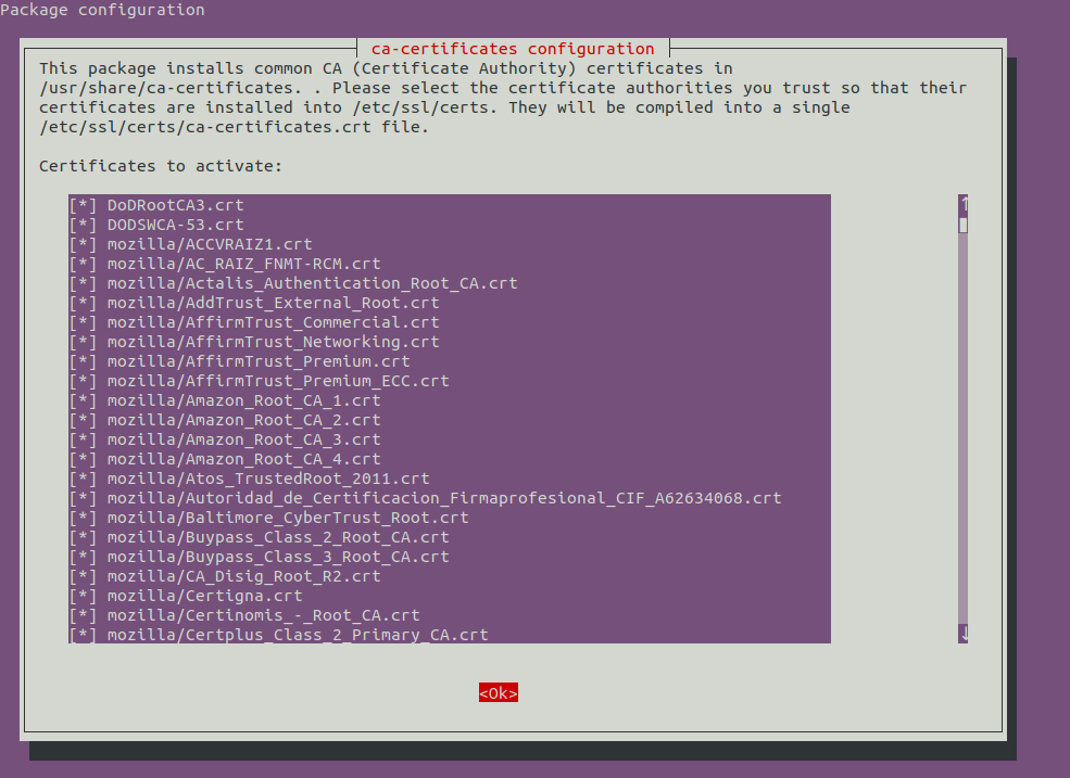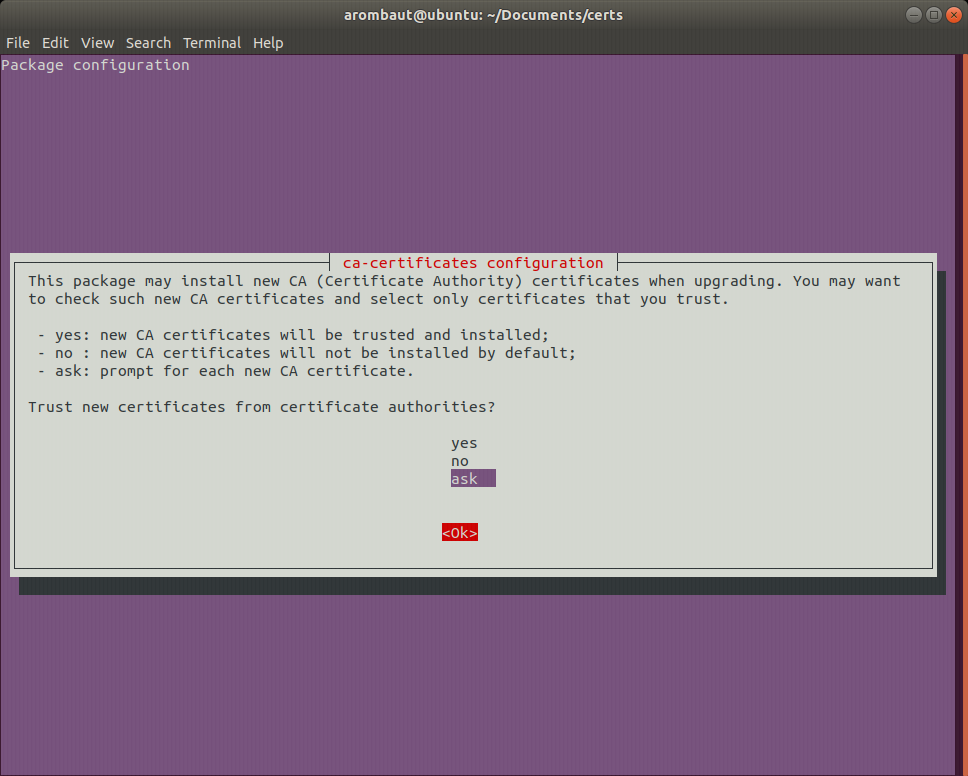 Now we want to reconfigure the certificate store by typing in sudo dpkg-reconfigure ca-certificates. This will open the ca-certificates configuration window. Choose Ask, then press tab to select <OK>.
