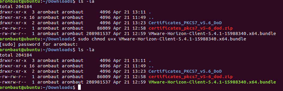 Type sudo ./VMware-Horizon and press tab. The rest of the filename should have auto-completed. Press Enter to continue to installation. Read and accept the EULA.