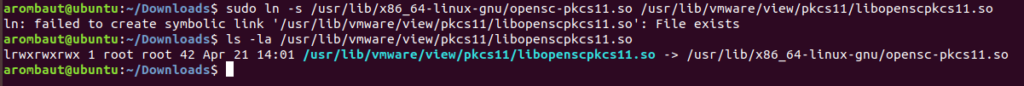 Now we are going to create a symbolic link to the OpenSC module. The VMware article helps with the syntax, but points to the incorrect location of the module. As long as you have been following along up to this point, you should not have any errors.