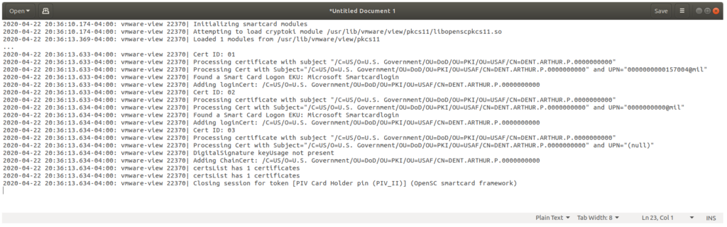 Hopefully you ran the steps above to verify that Ubuntu could see and access your Smart Card reader. This step will check the log and verify that it is working for the Horizon Client.