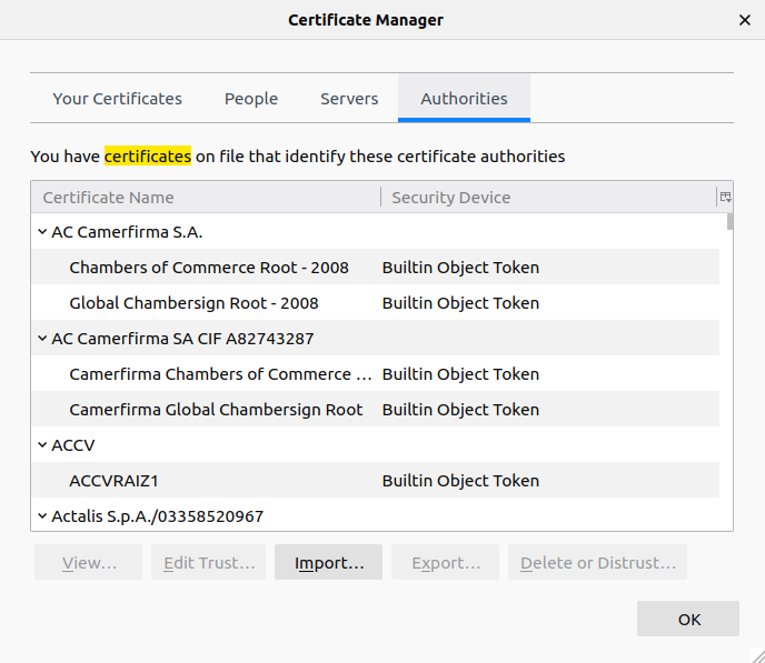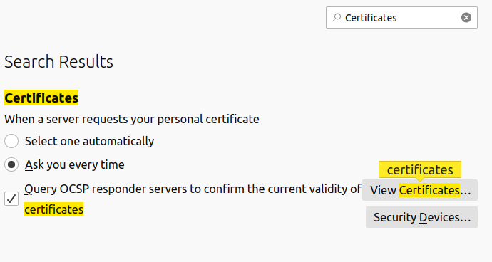 Open Firefox and select the three lines at the top-right of the window, then click on Preferences. In the Find in Preferences search box, type in Certificates. Click on the View Certificates… button.