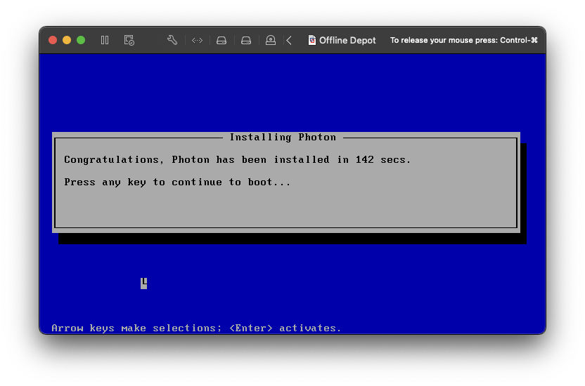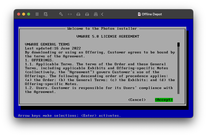 I am going to use a minimal Photon OS 5.0 GA image for the virtual machine to build the Offline Depot. The following steps are fairly basic and self-explanatory. I will include screenshots and applicable comments, when needed, for each screen.