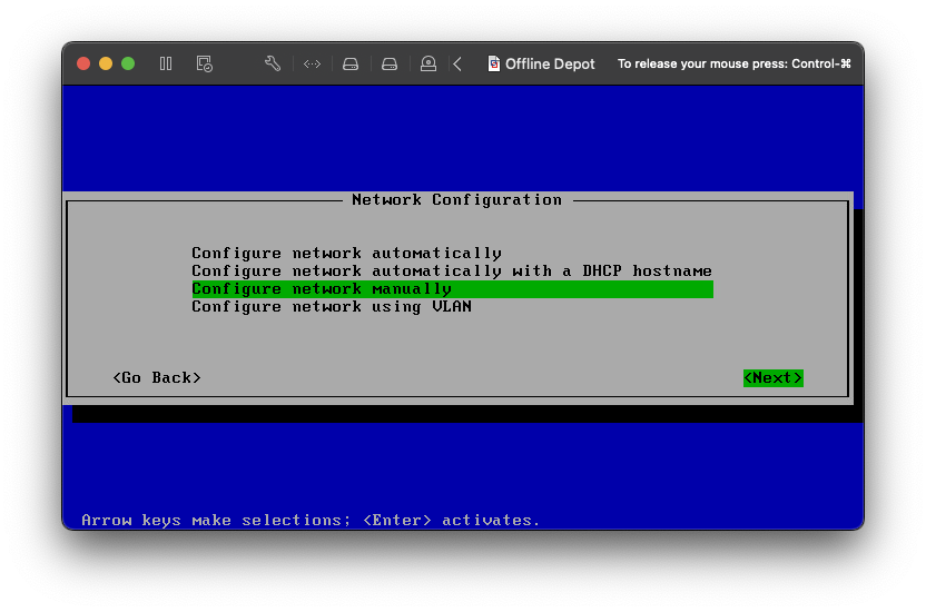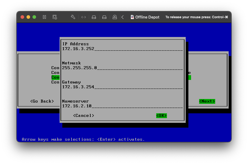 For the Network Configuration, I am configuring a static IP address.