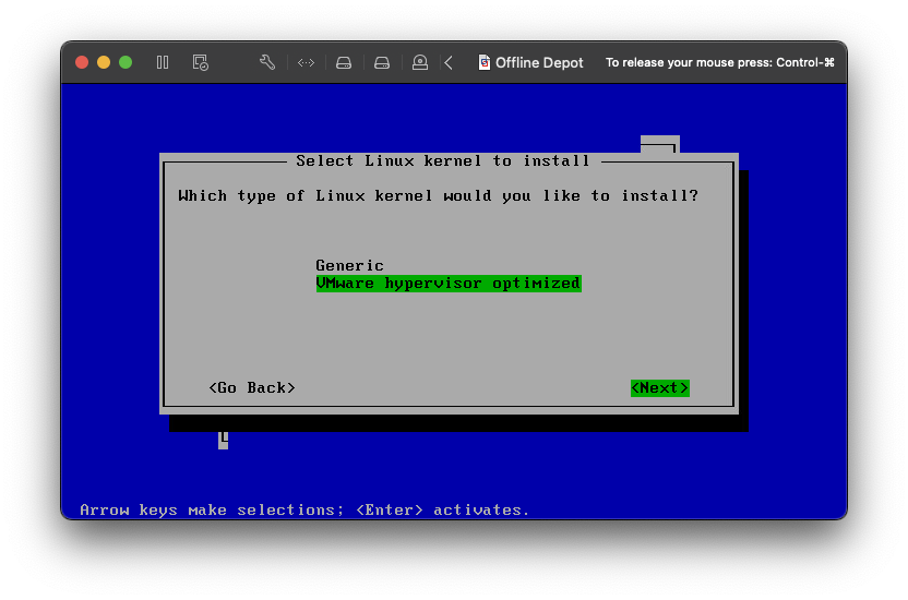 Since this virtual machine is running on VMware ESXi, I choose the VMware hypervisor optimized Linux kernel.