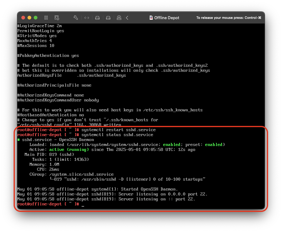 Restart the sshd.service service and check the status.