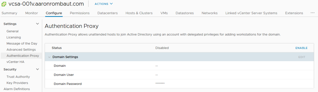 Go back to vSphere Client and configure the Authentication Proxy again. You may have to disable and enable the service again if you didn’t restart the service while connected through SSH. This time, it should work without an error. If you are tailing the log, then you should see Active Directory domain added successfully at the bottom.