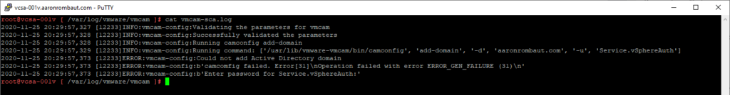 You can also view the log located at /var/log/vmware/vmcam/vmcam-sca.log. Below is an excerpt, notice the Enter password for Service.vSphereAuth line. That indicates that it was not sending the correct password because we know that we typed it into the window.