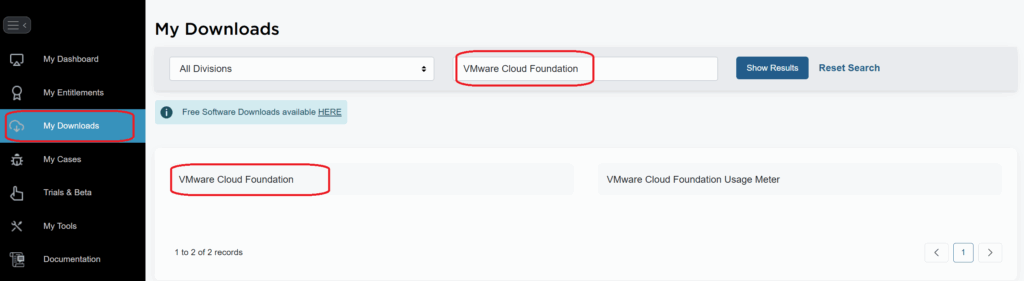 Click My Downloads and search for VMware Cloud Foundation in the search box. Finally, select VMware Cloud Foundation.