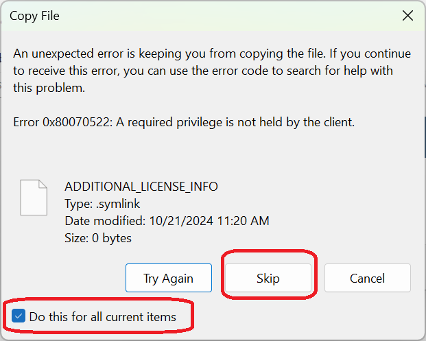 Extract the utility archive. This post was written using Windows 11 24H2, and the built-in “Extract All” option worked without issue. When prompted with a file conflict pop-up, simply check “Do this for all current items” and choose “Skip” to proceed.