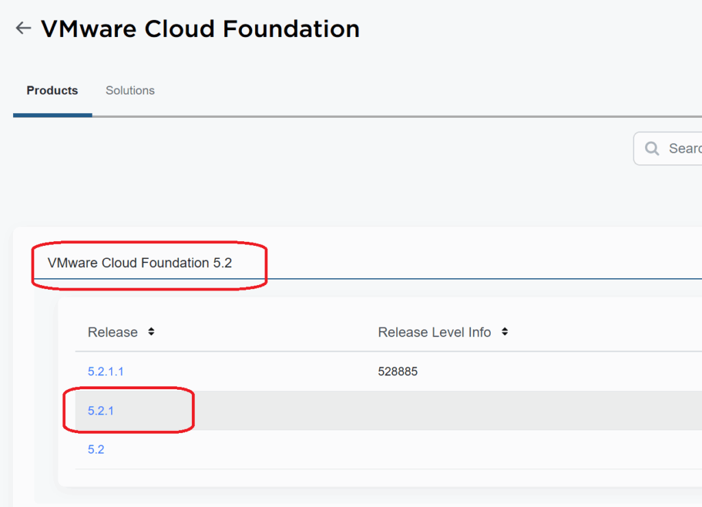 Select VMware Cloud Foundation 5.2, then select 5.2.1.