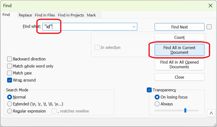 Input “id” in the Find what text box and select Find All in Current Document.