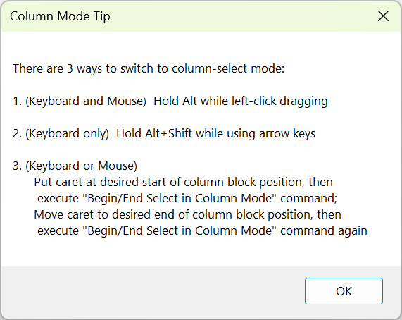 Review the Column Mode Tip menu for ways to use column mode.