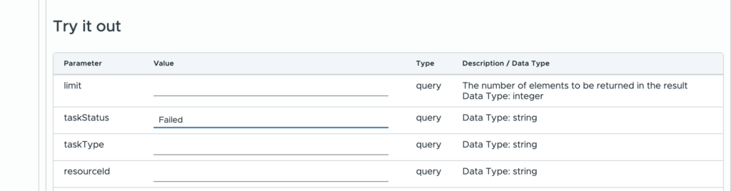Select the first GET to retrieve a list of all tasks. Scroll down to the Try it out section and locate the taskStatus Parameter. Enter the Value of Failed.