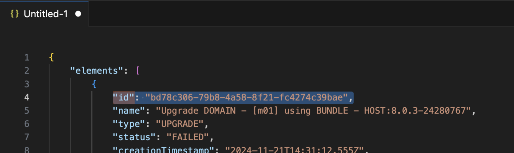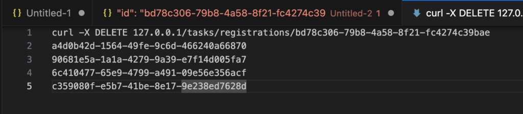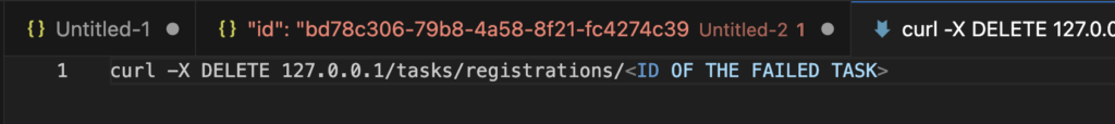 Go to the third tab or the tab with the curl command and replace the <ID OF THE FAILED TASK> text with the copied “id” contents.