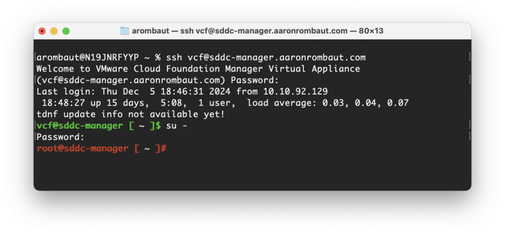 There are a few methods to accomplish the next step. The easiest is to make an SSH connection to the SDDC Manager. Log in as vcf, then elevate to root typing su -.