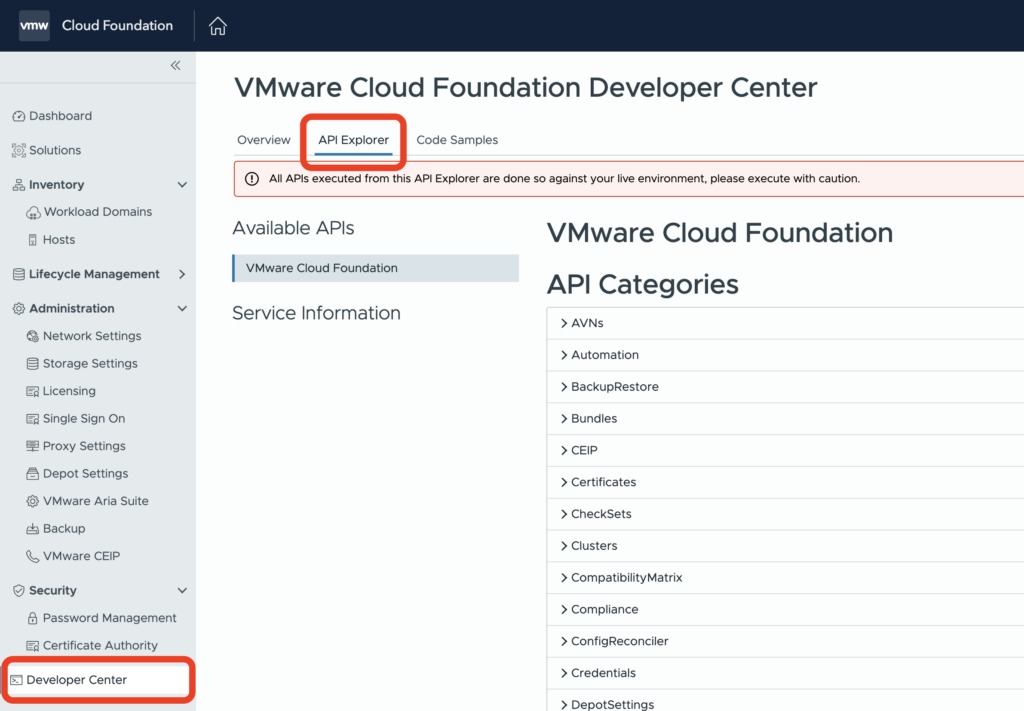 Start by logging into SDDC Manager. In the left side menu, select Developer Center at the very bottom.