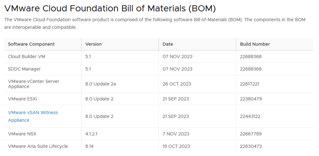 There are a few easy things to check that might be enough to get on the right track. First, read the release notes for the version of VMware Cloud Foundation (VCF) that is being installed. One of the most important pieces of information in the release notes is the Bill of Materials (BOM).