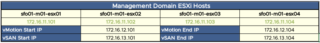 For VMware Cloud Foundation, it is expected that certain devices remain in a single network, such as all ESXi hosts or Tunnel Endpoints (TEP). Again, pay attention to the size of the networks. A Management Domain requires four (4) physical hosts. So at least four (4) addresses are required for host management (vmk0). But, there are usually two (2) physical network interfaces (NIC) per physical ESXi host and each NIC will get a TEP address. As you can see, below, using a /29 (255.255.255.248) would not contain enough addresses. One of the hosts will end up with only one address as the next consecutive address would be the broadcast address for the network.