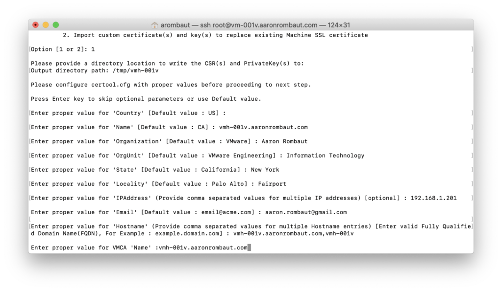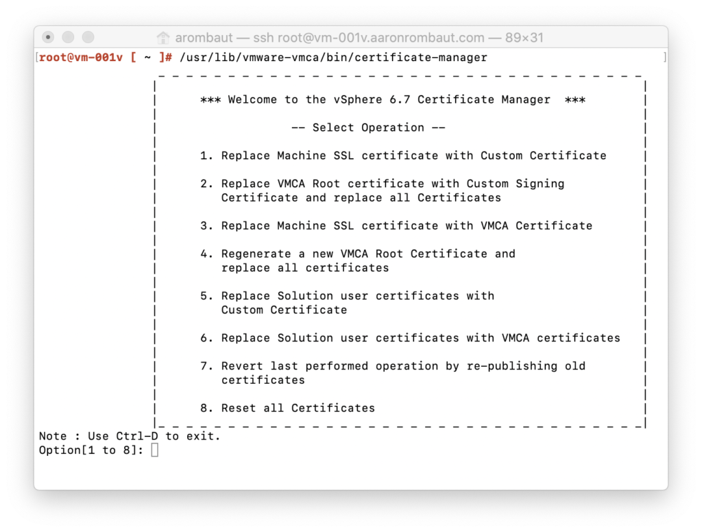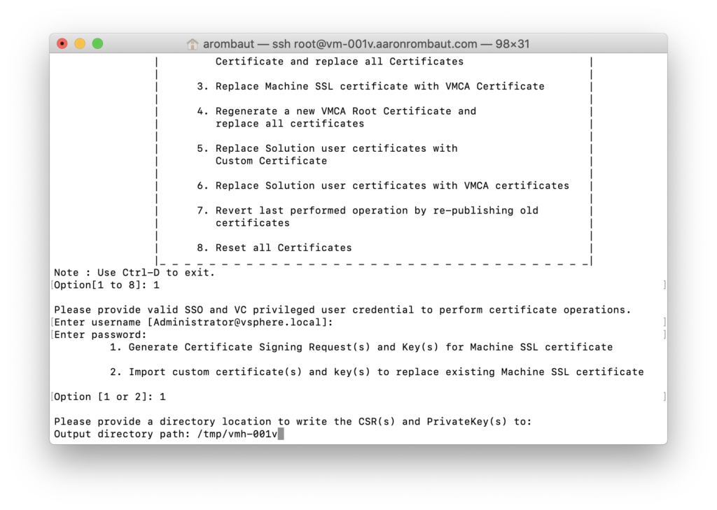 I use the certificate-manager tool (see below) included with vCenter to generate all of my requests. I found recently that you can skip this altogether if you can include the certificate’s key from the CA. In the traditional method, though, you will generate a CSR, submit to CA, and receive back a custom signed certificate.