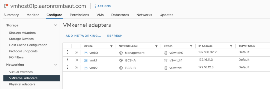 I created two VMkernel adapters, one for iSCSI-A and one for iSCSI-B. You can see from the screenshot below that I have one VMkernel adapter configured on the 172.16.11.0/24 subnet and the other adapter on the 172.16.12.0/24 subnet. These are layer 2 networks as I only need to connect to the Synology NAS through a switch. I do not want the traffic passing through a router; it would add unnecessary latency.