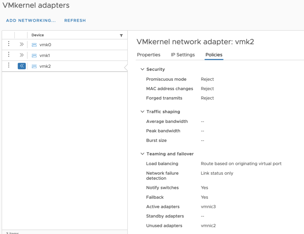 Regardless, I configure (think “pin”, here) the vmk1 VMkernel adapter to vmnic2. I make it the Active adapter and set vmnic3 to be an Unused adapter.
