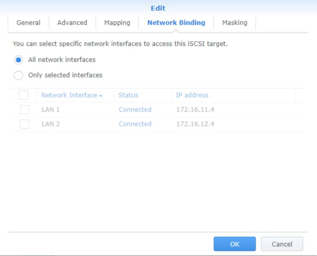 Open the iSCSI Manager and edit the target you are going to use for your ESXi hosts. Be sure to select the All network interfaces radio button on the Network Binding tab. You will also see a list of your configured Network Interfaces from Synology.
