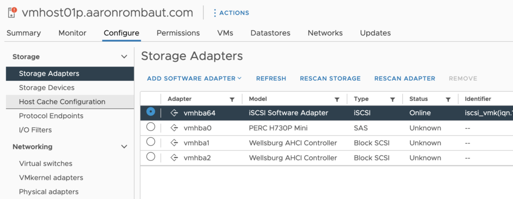 Go back to your ESXi host and configure the storage adapter. I only use a software adapter as this is more than sufficient for my use.