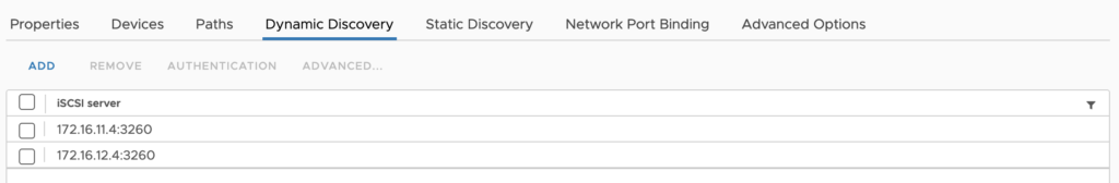 On the Dynamic Discovery tab, add the iSCSI target you configured on the Synology. You only need to add one of the configured addresses.