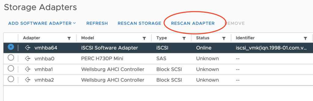 Once the address is in the table, click Rescan Adapter. This will reach out and connect to the Synology.
