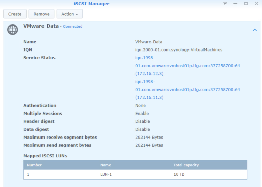 Back on the Synology, you can verify that your ESXi hosts are connected by checking the Service Status.